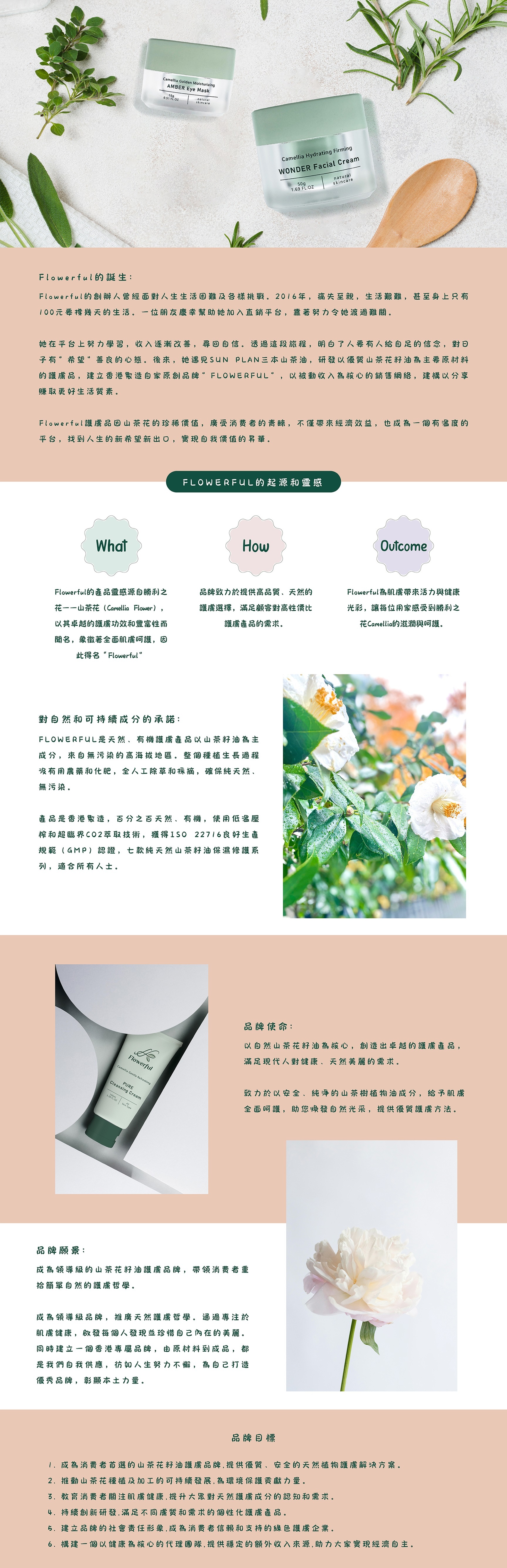 Flowerful 產品均在香港製造,百分百天然、有機。其主要成分有機山茶籽油採用最先進的低溫壓榨、物理精煉、超臨界CO2萃取技術,於香港已獲得ISO 22716良好生產規範(GMP)認證的設施之中,用心研製出獨特配方,推出七個高效呵護肌膚、適合所有人士的純天然